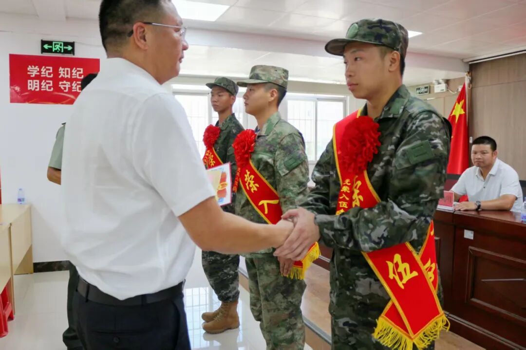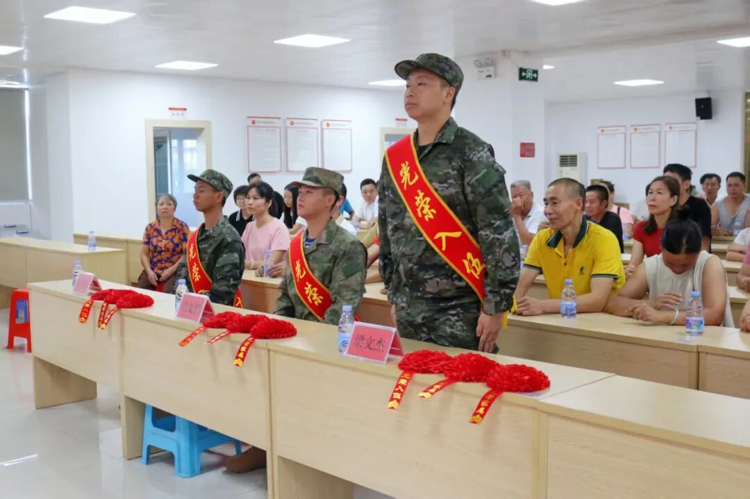 高平村党委书记梁泽荣为新兵逐一佩戴“光荣入伍”大红花,发放入伍通知书和慰问金,并勉励他们在部队努力奋斗、为国争光。